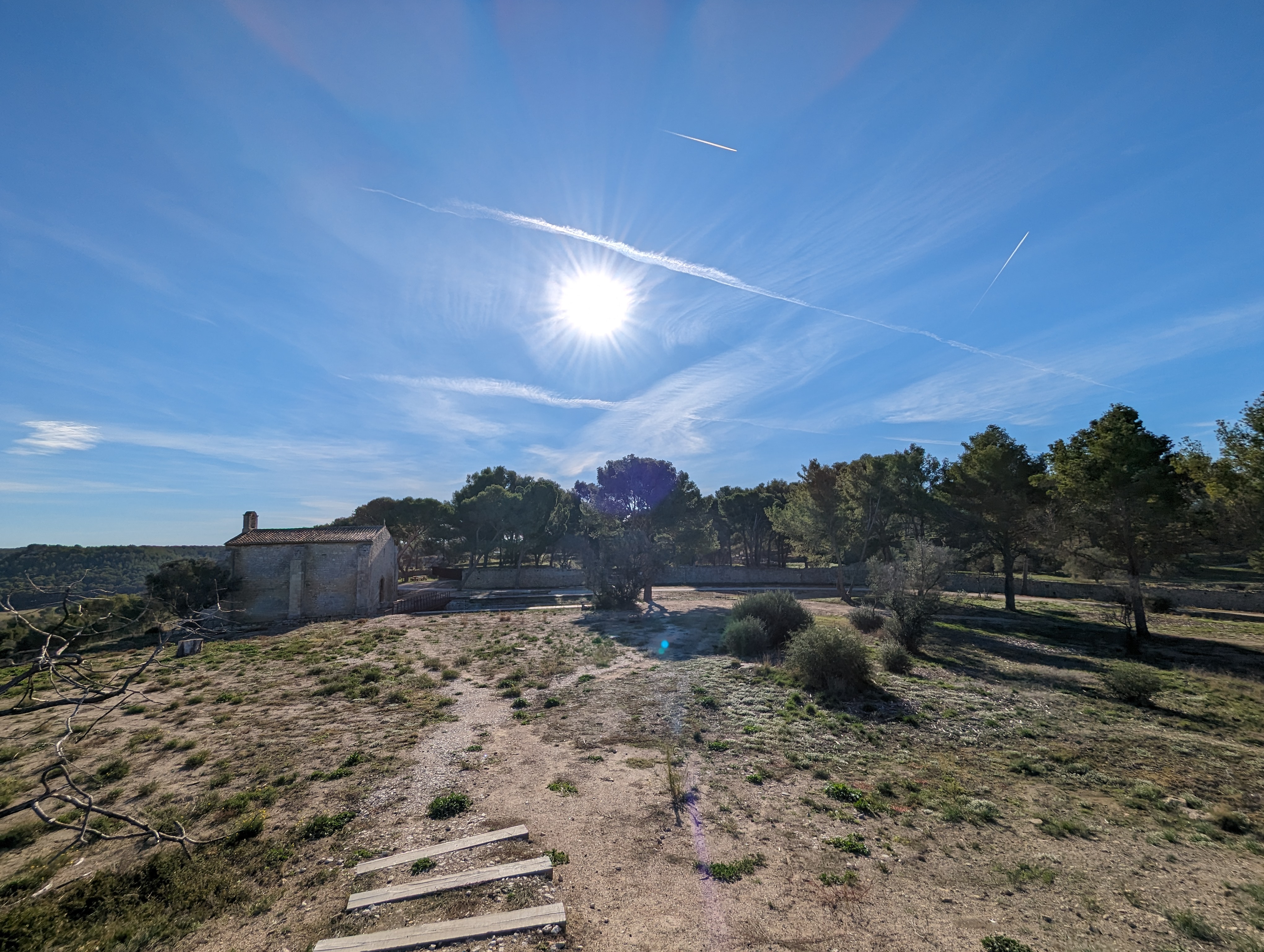 Site archéologique fermé, et travaux d'un immense bâtiment ultra-moderne à mon avis pas dans l'esprit du paysage environnant, mais joli endroit avec une chapelle et la vue sur les étangs dont certains sont teintés d'une étrange couleur mauve.
